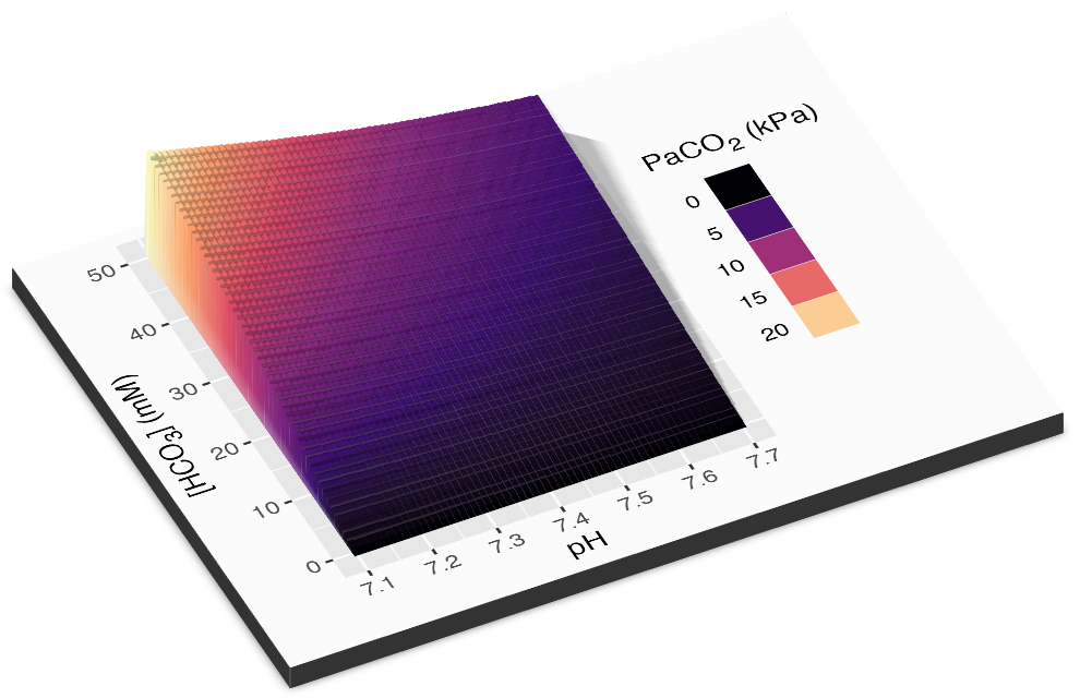 The relationship between pH, PaCO2 and HCO3 is described by the Henderson-Hasselbalch equation and can be plotted in three dimensions: